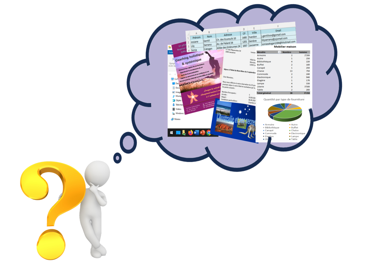 Que vous soyez débutant ou d'un niveau plus avancé, je vous accompagne dans vos besoins en matière de réalisations de documents ou, tout simplement, d'approfondissement de vos connaissances des outils Microsoft Office ou de l'environnement Windows.